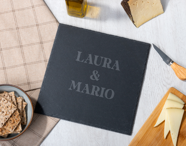 Plato de pizarra grabado con el texto que tú nos digas. Un producto único, de elaboración artesanal y que llegará al corazón de los amantes de la gastronomía. Dimensiones: 25 x 25 cm.