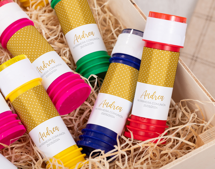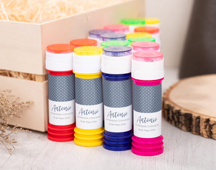 No todos los días tu hijo/hija celebra la Primera Comunión y como sabemos que es una celebración importante a la que asistirán familiares y amigos, puedes sorprenderles con un regalo único: ¡unos pomperos personalizados! Será el recuerdo ideal y más divertido para que nunca olviden este día tan especial. ¡Les encantará! Pero este original regalo para comuniones sin duda triunfará entre los invitados más pequeños, porque se lo pasarán en grande haciendo pompas sin parar. Y para que este detalle sea aún más especial, podrás personalizar su etiqueta con este precioso diseño y el nombre del protagonista de esta fecha tan importante. ¡Quedará genial! Toca Personalizar estos pomperos para que sean súper chulos. Elige cuántas unidades quieres, añade el producto al carrito y entra en el área de personalización. Lo único que tienes que hacer es completar este adorable diseño "Flores de comunión" con el texto que quieras. Nosotros nos encargamos del resto. ¡Será el mejor regalo del mundo! Dimensiones: 11,5 x 3,5 cm. Capacidad: 60 ml. Importante:El pompero se entrega vacío, podrás hacer tu propia mezcla con agua y jabón y rellenarlo todas las veces que quieras.