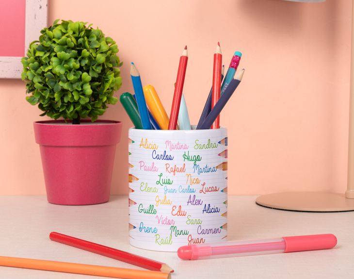 Hacerle una sorpresa al mejor profesor del universo nunca es fácil, pero lo más fácil siempre es apelar a lo sentimental. ¿Y qué mejor recuerdo de esa clase con la que ha pasado tan buenos momentos que con un portalápices de cerámica personalizado con todos los nombres de sus alumnos? ¡Podrá guardar sus bolígrafos favoritos sin problema! Un portalápices con diseño para profes como este será el detalle más bonito que puedes tener con esa persona que ha apoyado a tus hijos a lo largo del curso. ¡Es un regalo por toda la paciencia que ha tenido! Este portalápices cuenta con una altura de 9,5 centímetros y con un diámetro de 8 centímetros. ¡Es perfecto para tener a buen recaudo los rotuladores de corregir exámenes! No se nos ocurre un diseño más apropiado para este regalo original de fin de curso que un montón de lápices de colores cubriendo los nombres de sus alumnos. ¿Y cómo podrás personalizar este regalo tan exclusivo? En el diseñador, una vez que añadas el producto al carrito, podrás elegir el número de alumnos que tiene la clase. Una vez dentro de la plantilla solo tendrás que clicar sobre cuadro de texto para poder escribir el nombre que quieras. Altura: 9,5 cm. Circunferencia: 8 cm.