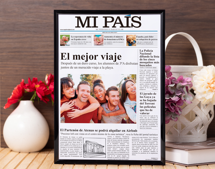 Un regalo original para felicitar a una buena amiga. Inspirada en el periódico global El País, esta portada personalizada te permitirá congelar un buenísimo momento que hayas pasado con ella. Añade una foto a "Mi País", y dale forma con un bonito titular y un subtítulo. Además, puedes personalizar la fecha de publicación para terminar de congelar el momento para toda la vida. Siéntete periodista por un día y regálale este detallazo a tu mejor amiga. Tienes dos tamaños a elegir: portada A4, y una portada gigante de 60 cm x 85 cm. Importante: El color del marco puede variar según stock.