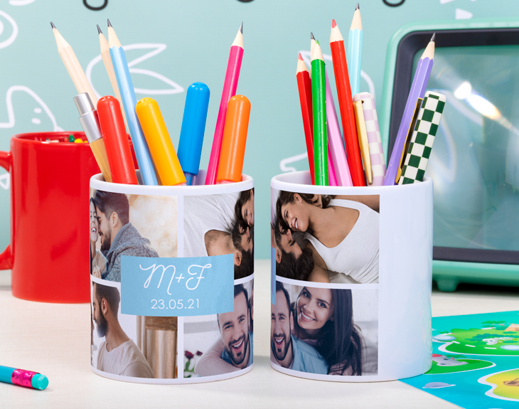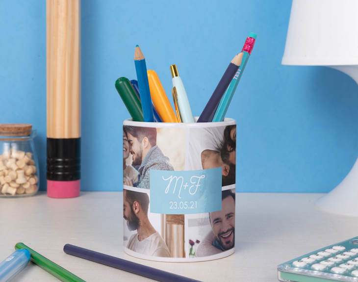 ¿Quieres hacer que la oficina de tu amorcito sea un lugar cálido que le recuerde a ti? Este portalápices de cerámica personalizado es el detalle más bonito que le puedes hacer al amor de tu vida. ¡Siempre podrá recordarte alguno de vuestros mejores momentos en este producto para guardar todos vuestros bolis! Las horas en el trabajo pueden llegar a ser realmente duras, por lo que un portalápices con diseño de collage de fotos puede ser el detalle más bonito para tu pareja. ¡Siempre estarás con él! El portalápices, hecho de cerámica, con altura de 9,5 centímetros y un diámetro de 8 centímetros, es un regalo de lo más útil para las personas que tienen que escribir mucho a lo largo del día. No habrá un mejor regalo original romántico para tu pareja que un portalápices como este, hecho específicamente para la jornada laboral. ¡Un detalle que le vendrá de gran ayuda! El diseño lo encontrarás en el área de personalización, una vez añadas el producto al carrito. Clica sobre cada cuadro para subir la imagen que quieras a la plantilla, ajustándola al diseño y confeccionando tu propio regalo. ¡Tú serás el creador! Altura: 9,5 cm Circunferencia: 8 cm.