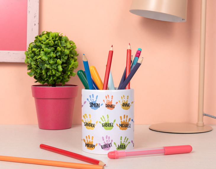 La clase más memorable de la historia se merece permanecer en el recuerdo del mejor profesor del mundo. ¡Este portalápices de cerámica personalizado podrá permanecer en su aula para toda la vida! Todas las generaciones venideras podrán comprobar la increíble clase que fue la de tu pequeño/a. Un portalápices con diseño de profes como este podrá ser el mejor detalle si quieres tocar el corazón del maestro más guay de todos. Y no solo será un gran regalo que le emocione... ¡También será un detalle de lo más útil! Al ser de cerámica le vendrá de lujo para guardar todos sus bolis favoritos en su interior, gracias a su altura de 9,5 centímetros y su diámetro de 8 centímetros. ¡Podrá estar en su escritorio para siempre! ¿Y qué mejor forma de personalizar este regalo original que con todas las manos de la clase? ¡Será como si ellos hubieran plasmados sus huellas en el portalápices! En el diseñador solo tendrás que elegir el número de alumnos que conforman la clase y escribir el nombre de cada uno sobre las diferentes huellas que encontrarás. ¡Crea el detalle más bonito para ese profe tan especial! Altura: 9,5 cm Circunferencia: 8 cm.