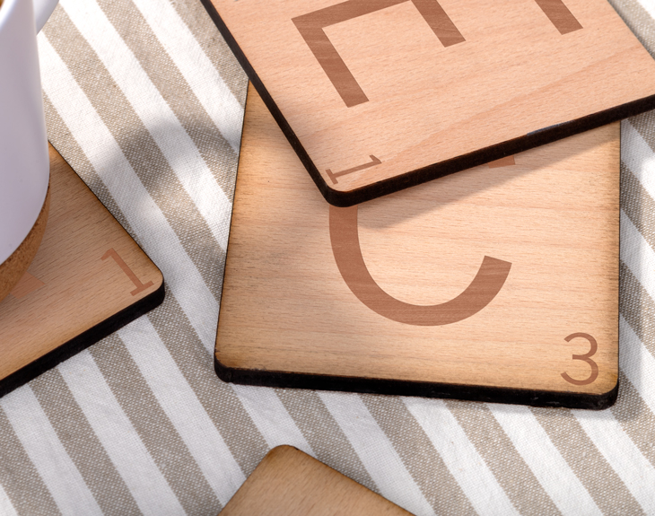 Si quieres dejar a tus invitados sin palabras, estos posavasos personalizados son el detalle perfecto. Seguro que conoces el divertidísimo juego de Scrabble...¡Ahora puedes hacer tus propios posavasos con el diseño de las fichas! También es regalo perfecto para sorprender a esa persona que adora pasar horas y horas jugando al Scrabble, o a esos amigos que se acaban de independizar y están decorando su nueva casa. Material: madera