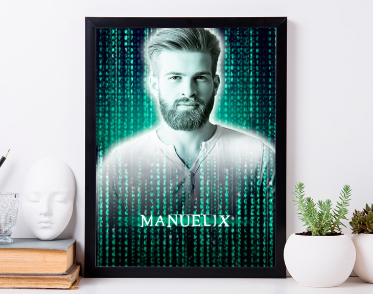 ¿Qué estarías dispuesto a dar para entrar en el impresionante mundo de Matrix? Neo tuvo que sacrificar su propia realidad y toda su vida anterior. ¡Pero tú estás a tan solo un clic de convertirte en el nuevo protagonista de esta fascinante historia creada por las hermanas Wachowski! Siéntete como Keanu Reeves o Carrie-Anne Moss con tu propio poster de cine personalizado. Morfeo te haría elegir entre la pastilla azul o roja, pero nosotros tan solo te vamos a pedir que nos digas tu nombre o el de esa persona tan friki de la saga, para poder escribirlo con esa icónica tipografía de la película. ¡Será el mejor regalo original para los más cinéfilos! Adjunta también una imagen con su mejor pose digna de la gran pantalla y nosotros nos encargaremos de darle el toque mágico. Puedes personalizar totalmente tu cártel de película con tu foto y tu nombre. Si lo quieres enmarcado, puedes llevártelo cómodamente en tamaño A4. O si lo quieres lucir en tu salón como en un buen cine, ¡atrévete con el tamaño de 60x85 cm sobre papel de póster! Recomendaciones para tu foto: -La imagen deberá ser lo más clara y nítida posible con bastante luz, ya que se recortará exactamente de la que se adjunte. -La persona no deberá aparecer muy alejada, con una altura mínima de medio cuerpo (este es el tamaño con el que aparecerá en el producto). -Recomendamos que aparezca la persona sobre un fondo lo más uniforme posible, y sin agarrarse a otras personas. Que se le vean todas las facciones del medio cuerpo. Importante: El color del marco puede variar según stock.