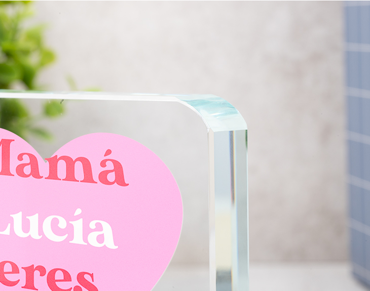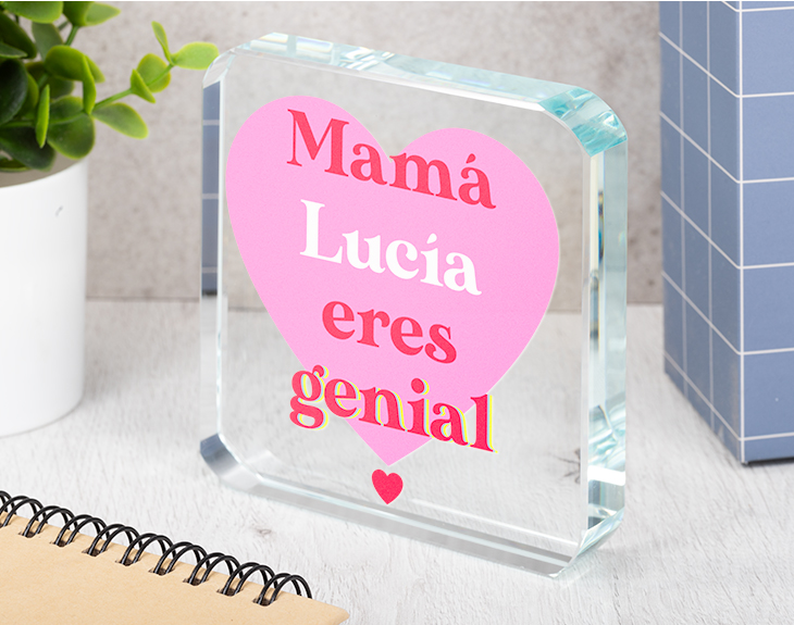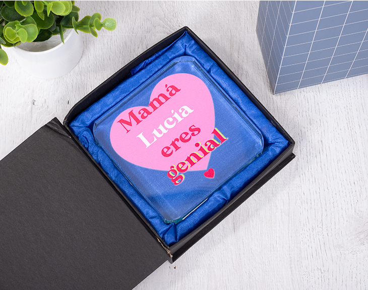 Estamos completamente seguros de que tu madre es genial en todos los aspectos de su vida. ¡Sorpréndela de la forma más única gracias a este prisma de cristal personalizado! Será un detalle que, más allá de decorar vuestro hogar, le dejará con la boca abierta. Un cristal perfecto para la mejor madre del mundo. Y es que este prisma de cristal con diseño de madre es el regalo perfecto para emocionar a esa mami que siempre lo ha dado todo por ti. Este cuadrado de cristal con bordes redondeados cuenta con una medida de 9,5 centímetros en cada uno de sus lados. Además, para que vaya bien protegido, este irá guardado en una caja de 13,5 x 12,5 centímetros. ¡Es perfecto para ella! ¿Qué es lo único que le falta a este regalo original? ¡Personalízalo con el nombre de esa gran madre! En el diseñador encontrarás varios diseños, hechos especialmente para ella. Escoge el que más te guste y clica sobre el cuadro de texto para escribir su nombre en el diseño. ¡Es un detalle perfecto para el Día de la Madre! Medidas del prisma cuadrado: 9,5 x 1,5 centímetros. Medidas de la caja: 13,5 x 12,5 centímetros. Material: cristal.