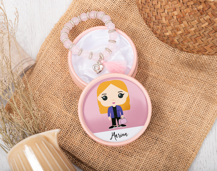 ¿Buscas un detalle con el que sorprender a esa persona tan especial? ¡Tenemos el regalo perfecto! Nuestra pulsera con cajita personalizada con diseño "Tinok Pop" es ideal para cualquier ocasión especial como el Día de la Madre, un cumpleaños, un aniversario... ¡Triunfarás seguro! Hay opciones de pulsera para elegir. ¡Seguro que alguna de estas le encanta! Pero lo mejor es que es personalizable. Podrás crear a este avatar Tinok como tú quieras. ¡Quedará genial! Personalizar esta pulsera con estuche es muy sencillo. El primer paso a seguir consiste en añadir el producto al carrito y entrar al área de personalización. Una vez ahí, ya puedes crear a este avatar Tinok como tú quieras. Pronto estará perfecto y listo para regalar. ¡Será un original regalo para madres! Medidas aproximadas de la pulsera: 25 cm de largo