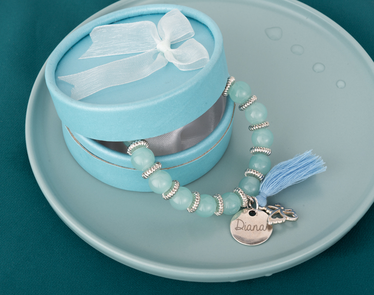• Pulsera "Perlas azules" con caja. • Caja para la pulsera. • Tarjeta Recordatoria.