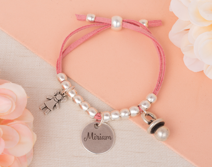 Si acaba de nacer la princesita de la casa y quieres tener un precioso detalle con su mamá, nuestra pulsera charm personalizada es la mejor opción. Y es que ahora que todos los mimos y caprichos son para la peque, le encantará recibir un regalo así de original. La pulsera incluye un charm de chupete, uno con forma de niña y una plaquita para personalizar con el texto que quieras. Se trata un bonito detalle con el que recordará una de las mejores etapas de su vida...¡Le encantará! En la fotografía aparece la pulsera de Ante Rosa, pero puedes escoger la que más te guste. Importante: Si no te convence esta combinación puedes dejar volar tu imaginación e inventar la tuya propia. En nuestra sección de bisutería encontrarás un montón de productos Charm para crear tus propios diseños...¡Puedes escoger hasta cinco abalorios diferentes!