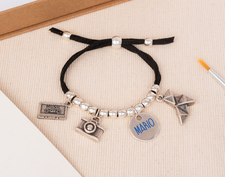 Pulsera personalizada con forma redonda. Puedes elegir absolutamente todo: charms que la acompañan, color de grabado, texto e incluso el tipo de pulsera. Es un proceso fácil y rápido que consiste en: - Elige una pulsera base. - Elige el texto a grabar en una placa de zamak. Elige también el color. - Elige tus charms: primero selecciona la cantidad y luego personalízalo. Tenemos más de 30 opciones diferentes.