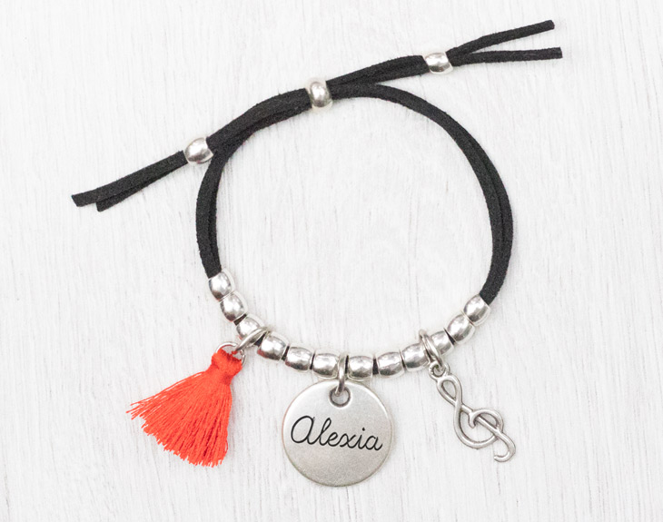 Si estás buscando una pulsera muy especial pero no sabes por cuál decidirte, el negro siempre es una buena opción. Elegante y muy sencilla, esta pulsera se convertirá en su accesorio preferido. Ahora solo queda que elijas los charms que mejor representen a esa persona tan estilosa y no se la quitará ni un solo día...¿No te parece una idea de lo más original? El funcionamiento es muy sencillo: - Elige el texto a grabar en una placa de zamak. - Elige tus charms: primero selecciona la cantidad y luego personalízalo. Tenemos más de 30 opciones diferentes. Material de los charms: Zamak.