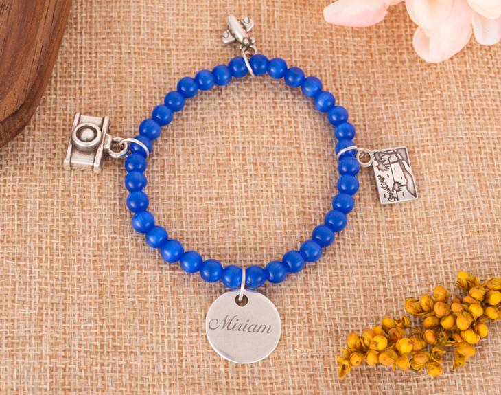 La pulsera personalizada ideal para esas personas que se pasan el día viajando y adoran vivir mil experiencias. Si tú también conoces a alguien así de aventurera e intrépida, este regalo original tiene su nombre...¡Seguro que le encanta! La pulsera incluye tres charms relacionados con viajar, así como una plaquita de zamak para personalizar. Puedes poner su nombre, una fecha importante o el lugar de su próximo viaje...¿No te parece una súper idea? En la fotografía aparece la pulsera de Ante Azul, pero puedes escoger la que más te guste. Importante: Si no te gusta esta combinación puedes dejar volar tu imaginación e inventar la tuya propia. En nuestra sección de bisutería encontrarás un montón de productos Charm para crear tus propios diseños...¡Puedes escoger hasta cinco abalorios diferentes! Material de los charms: Zamak.