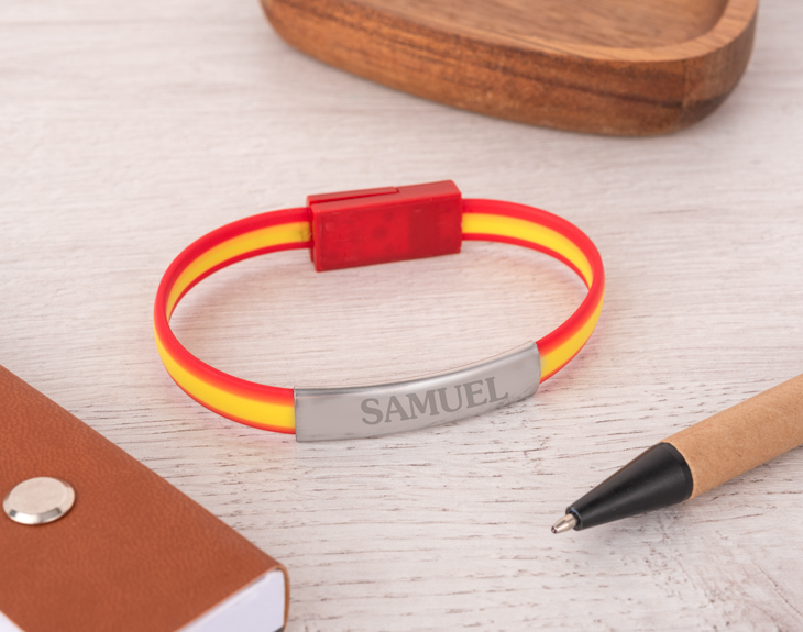 Y es que, aunque en apariencia es una pulsera grabada (ponemos el nombre que tú quieras), en la práctica se abre y se convierte en un cable USB - Mini USB. ¡Perfecta para cargar tu móvil en cualquier lugar!