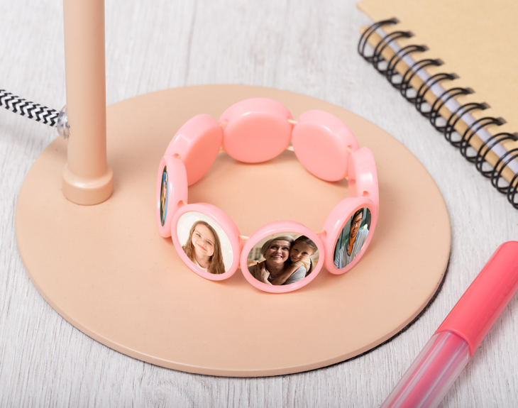 Pulsera personalizada para las niñas más divertidas. Se trata de una pulsera muy molona, pues puedes personalizarla con hasta 8 fotos diferentes. En cada círculo, pegamos un vinilo de la foto que tú quieras. Puedes elegir la misma foto para toda la pulsera, o diferentes para que quede más original. Hazle este regalazo a tu hija o una amiga y disfruta de la cara de sorpresa que ponga. ¡Es increíble! Material: plástico.