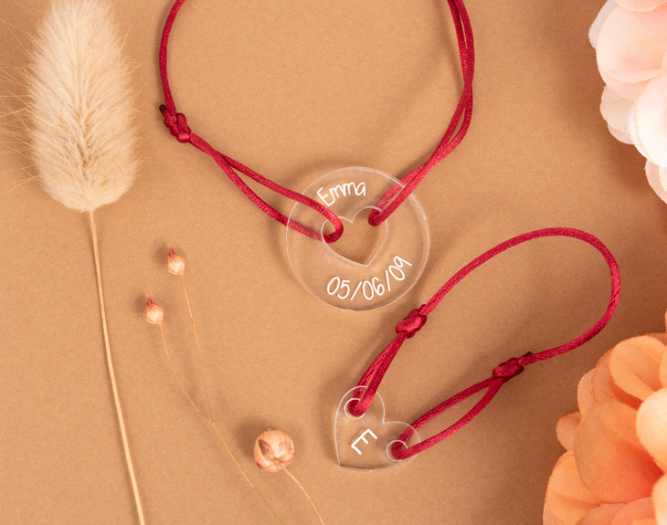 ¡Seguro que mamá y tú sois inseparables! Os encanta pasar tiempo juntos, os entendéis como nadie, os gustan las mismas cosas y sois un apoyo el uno para el otro. Tener una relación así entre los dos, no tiene precio. Por eso, si quieres sorprender a mamá con un regalo único y que podéis compartir ambos, estas pulseras de metacrilato personalizadas son perfectas. Será un detalle de lo más personal y genial para llevarlo siempre encima y acordaros mutuamente cuando no estéis juntos. El Día de la Madre, su cumpleaños o cualquier fecha donde mamá sea la protagonista, es el momento perfecto para regalarle esta original pulsera. Como ves en la foto, te llegarán a casa dos pulseras que tendrás que personalizar como tú quieras. Además, podrás elegir de qué color quieres que sea la cuerda de vuestras pulseras porque será el mismo para ambas. Es un regalo único y muy significativo para mamá y para ti, siempre os tendréis presentes estéis donde estéis. Personalizar estas pulseras de metacrilato es muy fácil. Añade el producto al carrito, elige el color de la cuerda y personaliza el texto. En la primera pulsera podrás escribir el nombre de mamá, una fecha, tu nombre o una breve dedicatoria... ¡Deja volar tu imaginación y haz la combinación que más te guste! Y en la segunda, la inicial que tú quieras. Así de sencillo es tener las mejores pulseras del mundo. Dimensión del perímetro desde 20 cm hasta 34 cm. Diámetro del círculo de metacrilato: 2,5 cm. Medidas de corazón de metacrilato: 1,5 x 1,5 cm aproximadamente. Importante: Las dos pulseras tendrán el mismo color de cuerda.