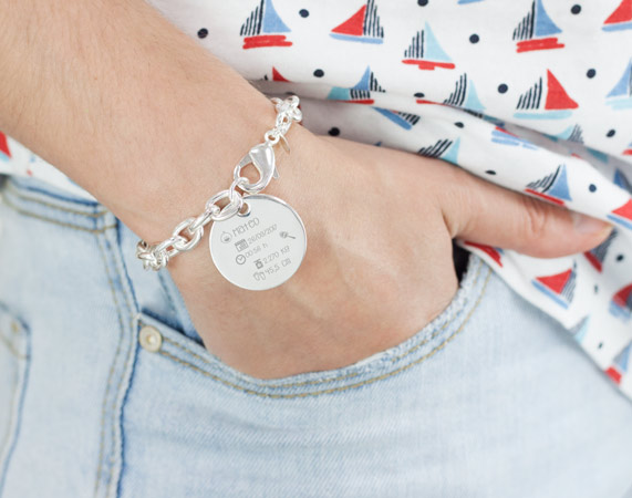 Lleva siempre en tu muñeca el nombre de tu bebé, además de datos tan significativos como el día y la hora de su nacimiento o su peso y su altura. Todo ello en una pulsera bañada en plata 925 grabada. Una pulsera de nacimiento es uno de los mejores recuerdos que puedes guardar para cuando tu pequeño crezca. Seguro que le encanta tener una pulsera con tanto valor sentimental....¡El regalo más original y emotivo del mundo! Longitud: 18cm.