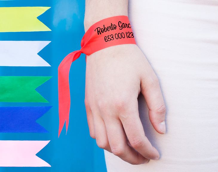 La mejor pulsera para tener controlados a tus hijos. En época de campamentos, excursiones del colegio o viajes en familia, es muy importante que los niños lleven una pulsera identificativa para por si se pierden en algún momento. Es muy normal que los niños se despisten y empiecen a jugar en otro lado. Por ello, esta pulsera de tela personalizada te vendrá muy bien. Personalízala con el nombre del niño y el número de teléfono para que, si se pierde en algún momento, cualquier persona pueda llamar y hacer que te reencuentres con tu hijo. Se trata de una pulsera de tela que está disponible en varios colores. Elige el color que más te guste, y escribiremos la información para enviártela lista para atar a la muñeca. ¡Súmate a la seguridad de los niños y aléjate de las preocupaciones! Medidas aprox: 3 cm x 40 cm.
