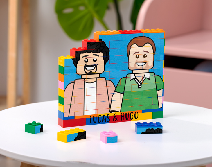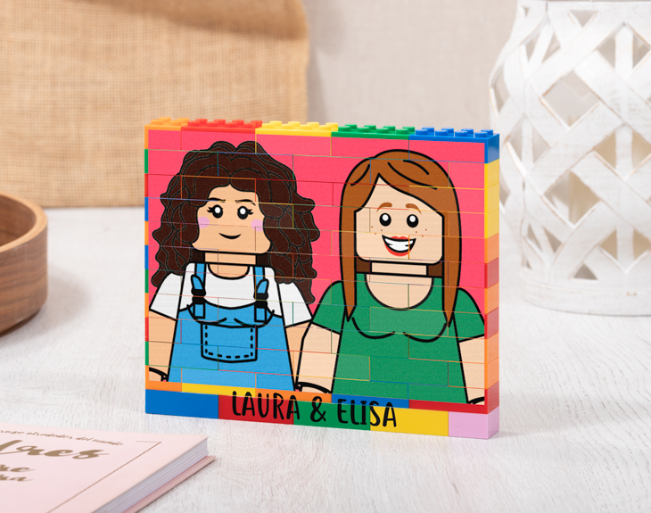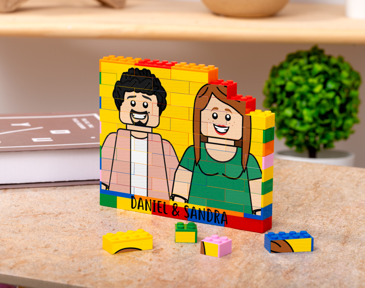 ¿Quién no disfrutaba de pequeño montando bloques de Lego para hacer muros, castillos o cualquier tipo de estructura que se te ocurriera? ¿Te imaginas poder hacerlo con tu pareja y que encima al crearlo podáis disfrutar de una pareja de Legos iguales a vosotros? ¡Con nuestro puzzle de bloques personalizado es posible! Será la mejor sorpresa por ese San Valentín tan esperado o ese aniversario tan especial. Nuestro juego de piezas de construcción con diseño de Lego llegará completamente montado y listo para que lo pongáis donde más os guste y darle un toque de lo más especial a ese rinconcito de casa. Tiene unas medidas de 14 cm de largo por 11,5 de alto, por lo que quedará perfecto en cualquier sitio. ¡Será el centro de todas las miradas! ¡No se nos ocurre un mejor regalo original para la pareja más animada y colorida! Selecciona este puzzle de bloques “Pareja Lego” y añade el producto al carrito para acceder al diseñador. ¡Ahí podrás personalizar las figuras Lego de la pareja como más se adecue a vuestras características! Cuando lo tengas decidido y vuestro propio avatar de Lego esté creado, podrás añadirle texto debajo y, ojo, no solo eso. Medidas: 14x11,5x1,5 cm. Material: plástico de colores. El color y tamaño de las piezas varían según stock. Importante: Este puzzle tiene fines decorativos y no está pensado como un juego. Para mantener su apariencia y durabilidad, evita desmontarlo.
