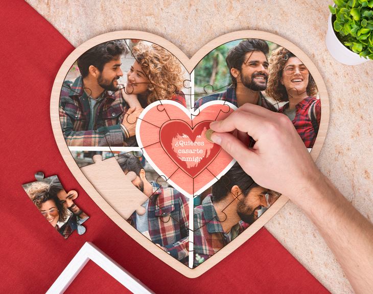 ¿Alguna vez has sentido que tu corazón explota ante ese irremediable amor que sientes en tu interior? Conocer a una persona que te acusa ese sentimiento no es nada habitual. El amor puede llegar a ser todo un dolor, pero también puede ser lo más bonito que te puede pasar en la vida. ¡El amor de nuestra vida nos puede hacer sentir como la persona más afortunada del mundo! Por eso, creemos que uno debe sorprender continuamente al amor de su vida, hacerle ver todo lo que sientes por él o ella de una forma especial. ¿Y es que hay una forma más única de avivar la llama del amor que con un regalo original que le llegue a la patata? Este puzzle corazón de madera personalizado le hará ver que el amor que sientes es verdadero. Este puzzle con corazón para rascar es un producto perfecto para dejar con la boca abierta a tu pareja. Está hecho en madera y cuenta con unas medidas de 35 x 27,5 x 0,8 centímetros. Tiene un corazón con un mensaje personalizado, tendrán que rascar el corazón para desentrañar una bonita dedicatoria. Elige vuestras mejores fotos y crea el collage a partir de la plantilla, que encontrarás en el diseñador. Luego solo tendrás que escribir la dedicatoria que quieras en el corazón que va para rascar. ¡Es el regalo más romántico! Medidas: 35 x 27,5 x 0,8 cm.