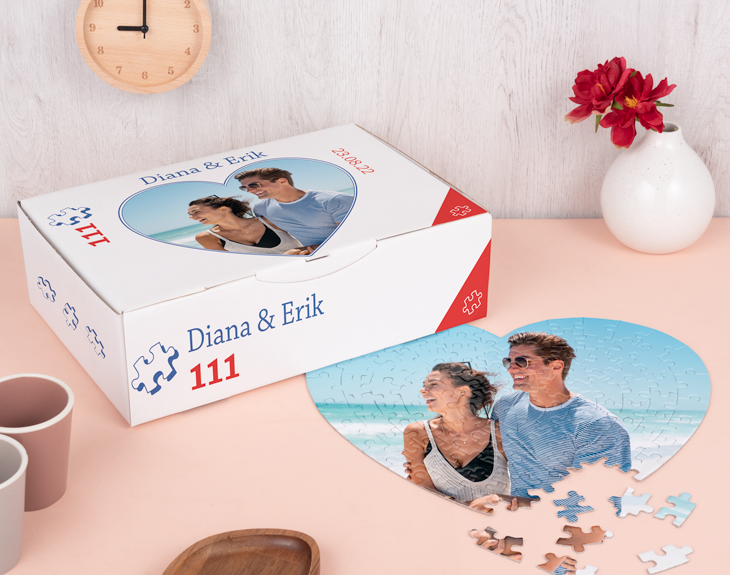 Importante: llamamos a este puzzle premium porque tiene un acabo que destaca frente a los demás. El material es más grueso y sostenible, y la impresión de la imagen capta todo tipo de detalles de la foto que nos envíes. El puzzle premium es de gran calidad, gracias a su composición y la posibilidad de plasmar la imagen con todo tipo de especificaciones. • Puzzle Corazón romántico (111 piezas) • Tarjeta recordatoria.
