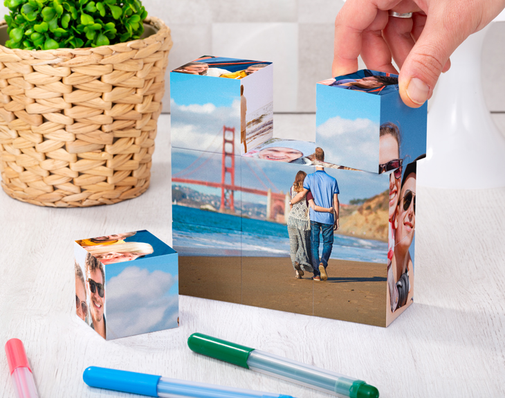 • Rompecabezas hecho con cubos personalizados. • Tarjeta Recordatoria.