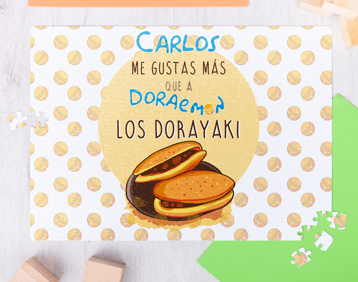 • Puzzle personalizado. • Tarjeta recordatoria. Los puzzles son un regalo divertido y original. Cualquier amante de los puzzles estará en cantado de recibir este detalle para resolverlo en su tiempo libre pero, ¿te imaginas su cara cuando vea que en el puzzle pone su nombre? Seguro que se quedará alucinado cuando sepa que es un regalo pensado en exclusiva para él. Además, su divertido diseño basado en Doraemon seguro que le enamora. Este puzzle personalizado está fabricado en cartón rígido y está disponible para su compra en tres tamaños: 70 piezas, perfecto para los principiantes y niños, 280 piezas, y 500 piezas, para los más expertos. Como es de esperar, a mayor número de piezas, más tiempo necesitaremos para completarlo y más difícil será resolverlos. Eso sí, nada produce más satisfacción que ver un puzzle completado después de horas intentando ajustar cada pieza. En cuanto al diseño del regalo en si, cuenta con un fondo en el que podemos encontrar un montón de cascabeles. Los verdaderos fans de Doraemon sabrán identificar el cascabel que el gato lleva siempre al cuello. Sobre este fondo, encontraremos escrita la frase principal del diseño: “me gustas más que a Doraemon los dorayaki”. Al final de la frase tenemos un divertido dibujo de dos dorayaki, el postre japonés favorito de Doraemon. La parte más importante del diseño, es decir, la parte personalizada, consiste en incluir el nombre del destinatario al inicio del texto. Este regalo es perfecto para cualquier aficionado a los puzzles, sobre todo, si de pequeño veía los dibujos de Doraemon (o los sigue viendo). También encantará a cualquier persona amante de todo lo japonés y del mundo del anime y el manga. Regálale horas de diversión con este original puzzle y, cuando lo tenga resuelto, podrá colgarlo en su cuarto para que decore su habitación de la mejor manera. ¡Un detallazo!