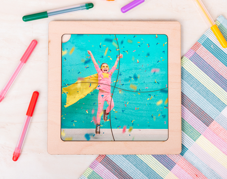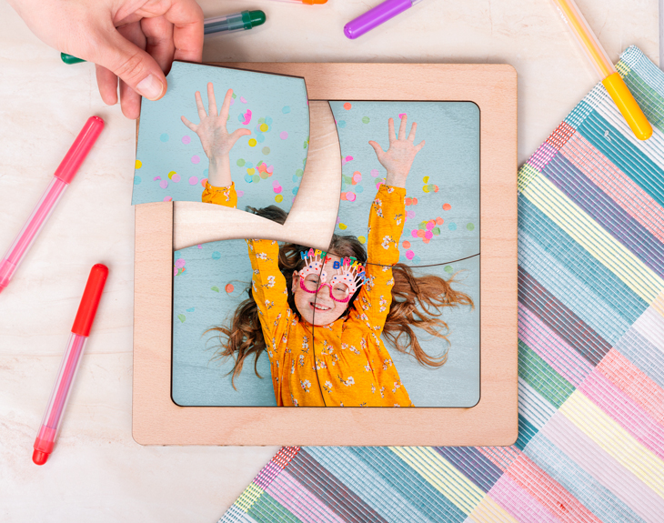 • Puzzle de madera de 4 piezas. • Tarjeta recordatoria.