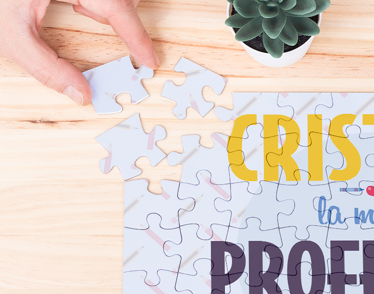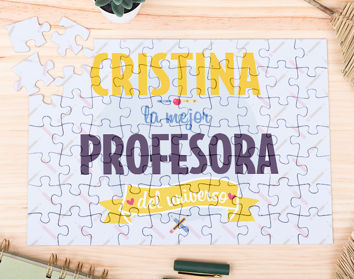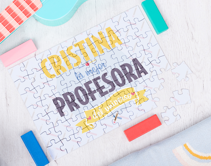 ¿Queréis agradecer a vuestra profe todo lo que habéis aprendido este curso en sus clases? Entonces, este puzzle personalizado es el regalo perfecto. Este puzzle personalizado es una bonita y original forma de sorprender a vuestra profe por el final de las clases. Seguro que le hace mucha ilusión que todo sus alumnos le hagan un detalle como este. Simplemente nos tendréis que decir el nombre de vuestra súper profe y nosotros nos encargaremos del resto. ¿No os parece una idea genial? Este modelo de puzzle está disponible en tres tamaños diferentes: Medidas puzzle de 70 piezas: 21 cm x 30 cm. Medidas puzzle de 300 piezas: 30 cm x 40 cm. Medidas puzzle de 500 piezas: 34 cm x 48 cm.