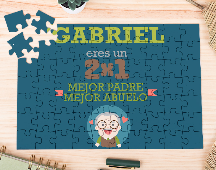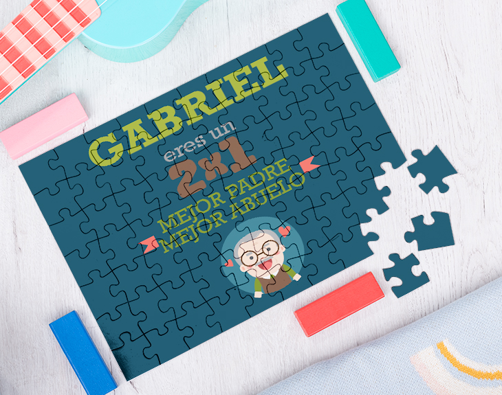 Este Día del Padre regálale un poco de entretenimiento y mucho, mucho amor. Si está todo el día sin parar de trabajar cuidando de su nieto/a y ayudándote en todo lo posible, se merece un tiempo de relax y juegos con su hijo. Crea ese momento especial para unirte con tu papá utilizando este puzzle personalizado. Lo pasaréis genial montándolo y, cuando lo tengáis, podrás decirle de la manera más sorprendente que es el mejor padre y abuelo. Además de ser un divertido juego de mesa para padres e hijos, también puede ser un bonito elemento de decoración para su casa. ¡Seguro que quiere conservarlo y enmarcarlo! Con su precioso y colorido diseño, será un fantástico regalo original para el Día del padre o para su cumpleaños. Aunque no sea un aficionado a los puzzles y juegos de mesa, podéis elegir entre el puzzle de 280 piezas o de 70 piezas. Sea el tamaño que sea, podrás escribir su nombre sobre el diseño impreso a todo color en las piezas. Medidas puzzle de 70 piezas: 21 cm x 30 cm. Medidas puzzle de 280 piezas: 30 cm x 40 cm.