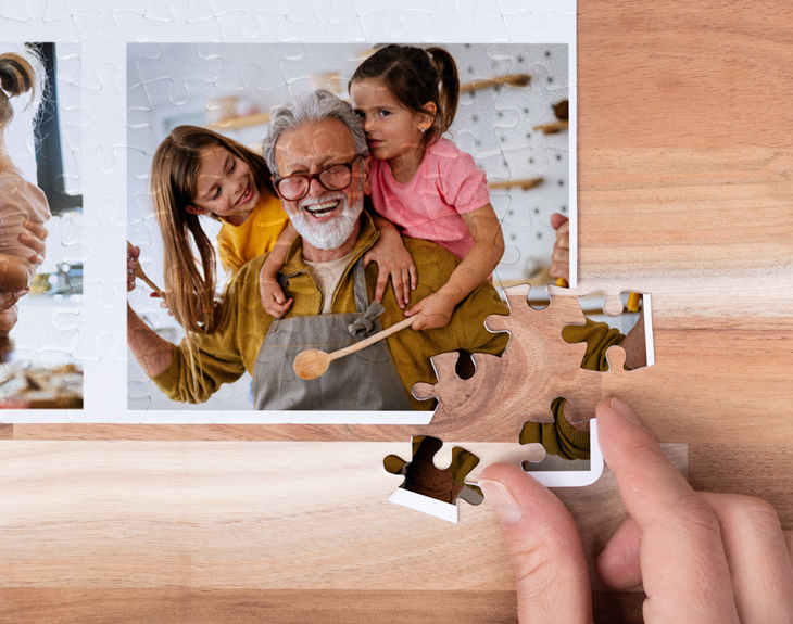 Seguro que se te vienen a la mente muchísimos momentos incomparables junto a la persona más entrañable de tu entorno. Esa persona no es otra que tu abuelo, un hombre que siempre lo ha dado todo por su familia. ¿Siempre que estáis juntos rememoráis alguno de vuestros mejores momentos? Este puzzle personalizado está hecho para revivir algunos momentos que siempre tenéis en vuestra mente. Para todos esos abuelos cariñosos que no pueden vivir sin pasar los días con su familia contamos con este puzzle con collage de fotos. ¡Toda la familia podréis pasar un rato increíble montando este rompecabezas! Podrás elegir el número de piezas que quieres para este pasatiempo. ¿Sois capaces de construir un puzzle de 70, 300 o 500 piezas? ¡Es vuestro momento para disfrutar en familia! Si os apetece pasar una tarde de lo más nostálgica, este regalo original para el mejor abuelo está hecho a la perfección para él. ¿Cómo podéis crear un collage único como este? Una vez escojas el número de piezas que quieres para tu puzzle, podrás elegir el diseño que quieres para tu producto. Escoge las fotos que quieras y súbelas al sistema. ¡Solo tendrás que organizar las imágenes como quieras! El cartón es más duro de lo normal para que disfrutes de una mayor calidad de juego.