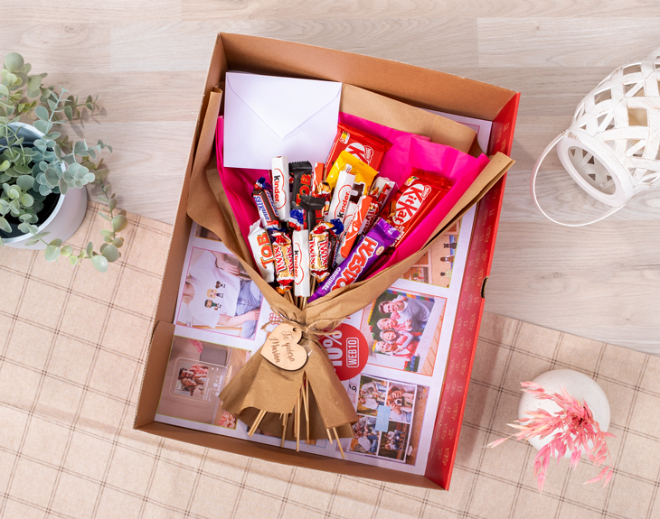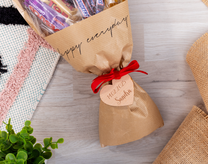 • Ramo de veinticinco chocolatinas. • Corazón de madera personalizado. • Tarjeta Recordatoria.