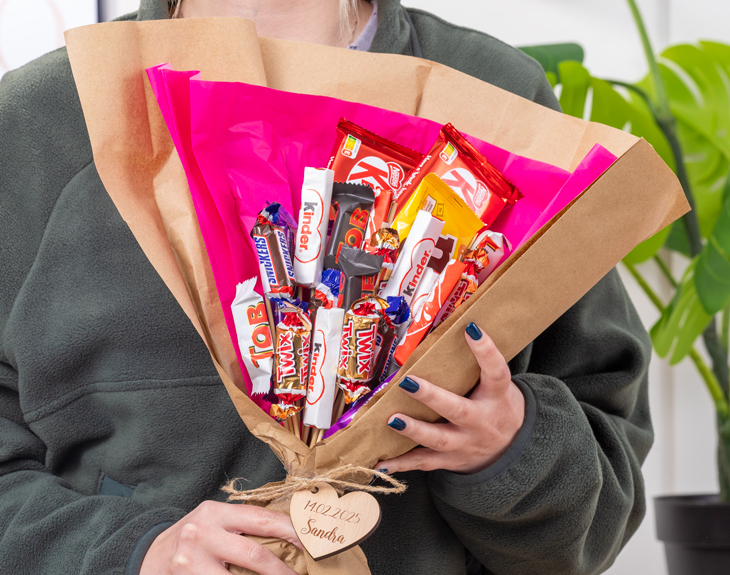 ¿Hay algo más romántico que regalar flores en el Día de los Enamorados? Si este año quieres sorprender a tu pareja con un detalle original, tenemos justo lo que necesitas: nuestro ramo de chocolatinas con corazón personalizado, una mezcla perfecta de dulzura y romanticismo. Lo que hace especial a este ramo es el corazón de madera personalizado que lo acompaña, el cual puedes personalizar con el nombre o mensaje que más te guste. ¡Imagina la sorpresa de tu pareja al ver su nombre en el corazón! Solo tienes que indicarnos qué deseas que inscribamos, puede ser un nombre o un fecha importante. Nosotros nos encargaremos de que quede perfecto. Un detalle tan tierno que expresará todo tu cariño. Este ramo es el regalo ideal para cualquier ocasión: San Valentín, un aniversario, un cumpleaños… O simplemente porque sí. Será un regalo muy especial y lleno de dulzura. Personalizar este ramo es muy fácil: Solo tienes que añadirlo al carrito, acceder al área de personalización e introducir el nombre o mensaje que deseas en el corazón. ¡Y listo! Pronto te haremos llegar este ramo preciosamente montado. ¡Es un regalo original para parejas! Recuerda que puedes elegir la opción de regalar este ramo con una caja hecha especialmente para ramos. Importante: El ramo contiene un mix de 25 chocolatinas (Kit Kat, M&M, Kinder, mini Toblerone, Huesitos, Snickers y Twix). Medidas aproximadas: 43 cm x 40 cm.