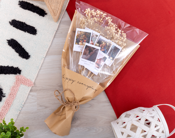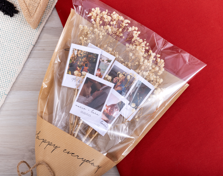 ¿Cuál es el recuerdo más especial que tienes con tu pareja? Seguro que hay un montón de momentos que guardáis con cariño en la memoria. Y si además tenéis fotos que habéis retratado juntos y que os encanta mirar una y otra vez, tenemos justo lo que necesitas. Un ramo de fotos polaroid es el detalle perfecto para sorprender a tu pareja con un regalo único y lleno de emoción. Ya sea para San Valentín, un aniversario o cualquier otra fecha especial, este ramo hará que ese día se convierta en un recuerdo inolvidable. Sabemos que elegir una sola foto de toda vuestra galería es complicado, ¡por eso podrás escoger hasta 6 fotos! Imágenes de un viaje juntos, fotos en las que salís radiantes o aquellas que os transportan a momentos felices... Cualquier foto que tenga un significado para vosotros será perfecta para este regalo. Cada vez que las miréis, os trasladarán a esos momentos tan especiales. Además, el ramo incluye unas preciosas flores secas que, sin duda, dejarán a tu pareja sin palabras. Personalizar tu ramo de fotos polaroid es muy sencillo. Solo tienes que añadir el producto al carrito, entrar en el área de personalización y elegir las 6 fotos que más te gusten. También podrás añadir el texto que desees para hacerlo aún más único. En poco tiempo tendrás el regalo perfecto, listo para sorprender a esa persona tan especial. ¡Un regalo original para parejas! Recuerda que puedes elegir la opción de regalar este ramo con una caja hecha especialmente para ramos. Medidas: 45 x 35 cm. : Son flores naturales, por lo que al recibir el ramo hay que sacarlo del plástico para que se mantenga en perfecto estado.
