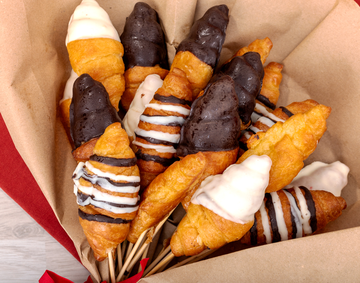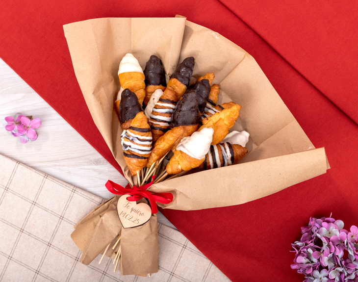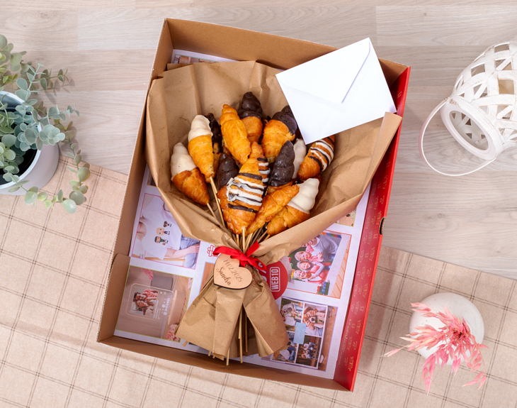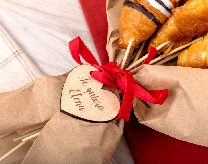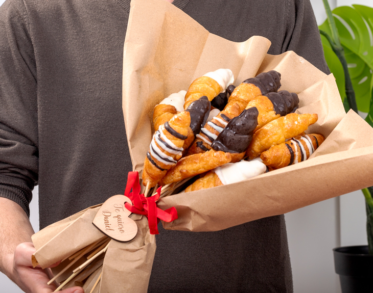 Los Manolitos son, sin lugar a dudas, los croissants más famosos del mundo. Y, ¿qué mejor forma de comenzar el día que con un delicioso ramo de croissancitos artesanales bañados en almíbar? Acompañados de un buen café o tu bebida favorita, será imposible resistirse a estos dulces. Si estás pensando en cómo sorprender a tu pareja este Día de San Valentín, en un aniversario o en cualquier ocasión especial, tenemos justo lo que necesitas. Este ramo de Manolitos con corazón grabado es el detalle perfecto para regalar una momento romántico. Lleno de croissants, se convertirá en el regalo más original para empezar el día con una sonrisa. ¡Le encantará! Lo más especial de este ramo es el corazón de madera grabado que lo acompaña, el cual puedes personalizar con el nombre o mensaje que más te guste. ¡Imagina la cara de sorpresa de tu pareja al ver su nombre grabado! Solo tienes que indicarnos qué deseas que inscribamos: un nombre, una fecha importante, o lo que más signifique para ti. Nosotros nos encargaremos de hacerlo con todo el detalle. ¿Cómo personalizar este ramo? Es muy fácil. Solo añade el producto al carrito y entra en el área de personalización. Ahí podrás agregar el nombre o mensaje que quieres que grabemos en el corazón. ¡Y listo! En breve te haremos llegar este precioso ramo montado. ¡Un regalo original para parejas! Importante: El ramo contiene 20 Manolitos.