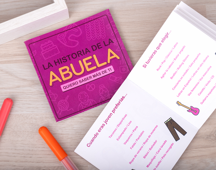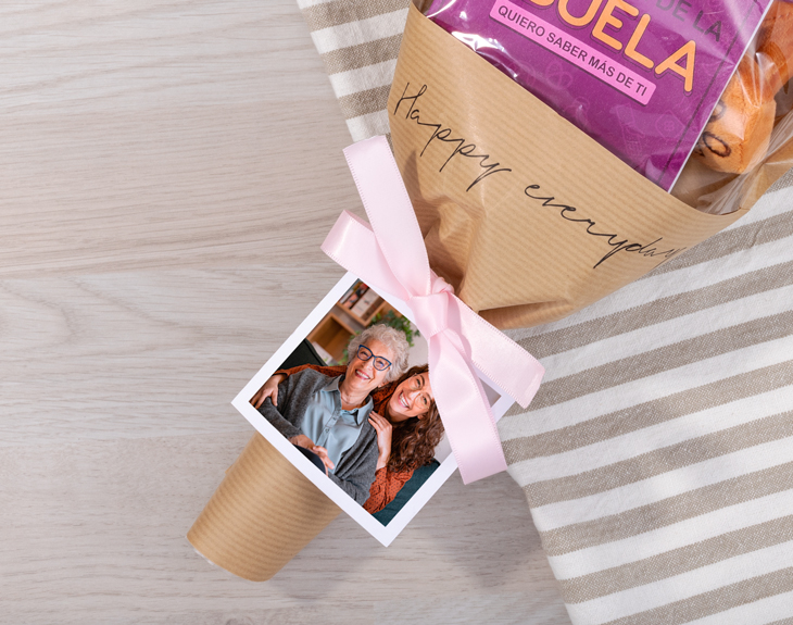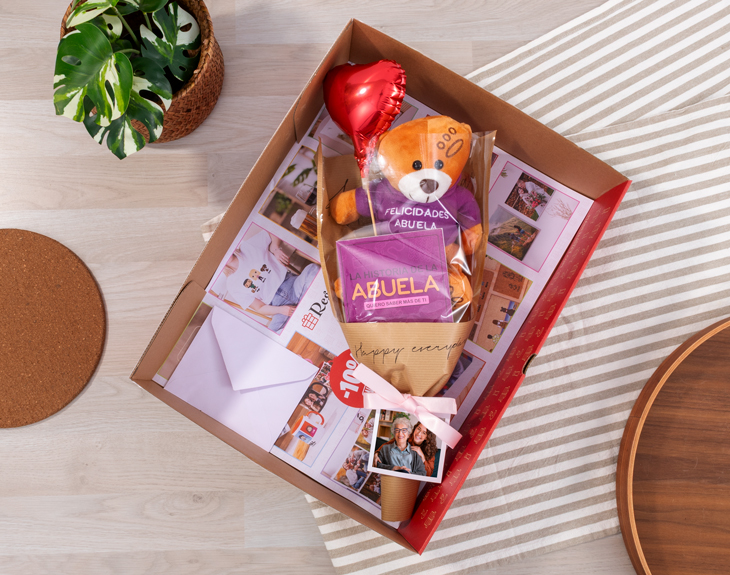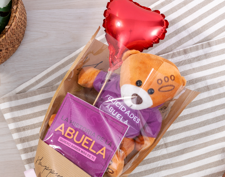 • Oso con camiseta "Felicidades abuela" • Libro "La historia de la abuela" • Globo corazón • Polaroid personalizada • Tarjeta recordatoria.