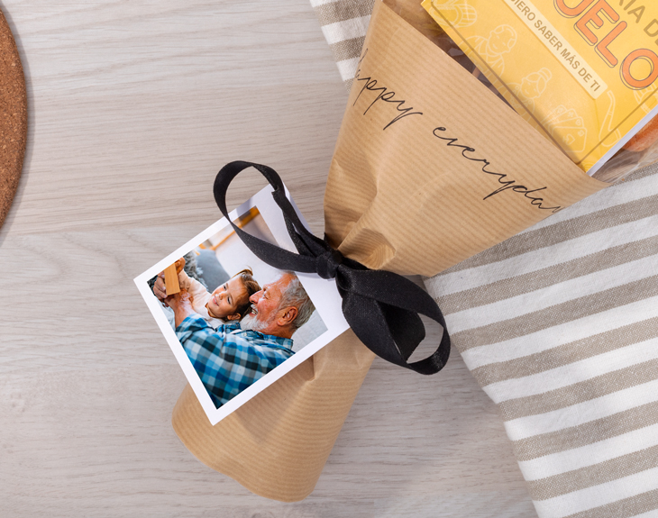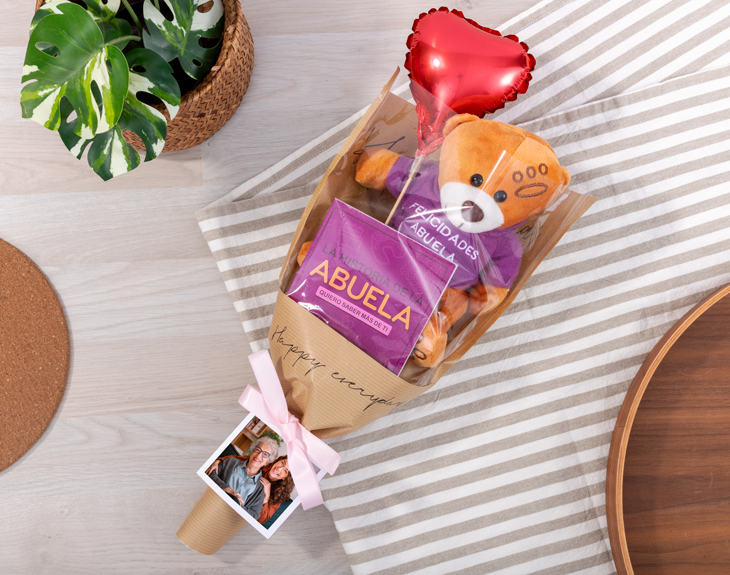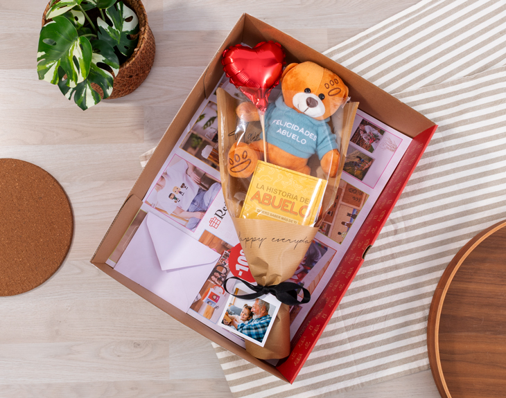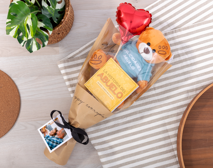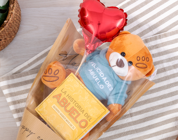 • Oso con camiseta "Felicidades abuelo" • Libro "La historia del abuelo" • Globo corazón • Polaroid personalizada • Tarjeta recordatoria.