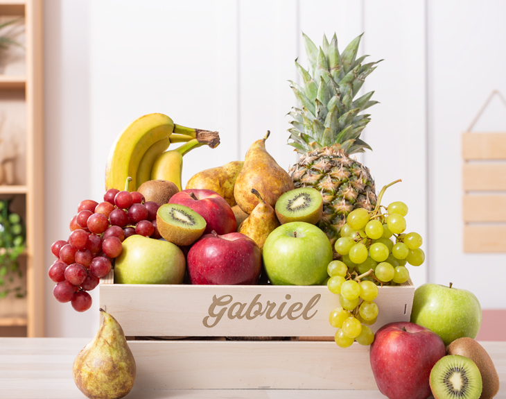 Esta cesta siempre va equipada de diferentes tipos de fruta básicas, como manzanas, plátanos, peras, o mandarinas, a las que luego sumamos frutas más exóticas (por ejemplo, piña, coco o mango). Depende de la cesta que elijas, llevará unas frutas u otras, porque la ocasión a veces requiere unos sabores y otras veces, otros.