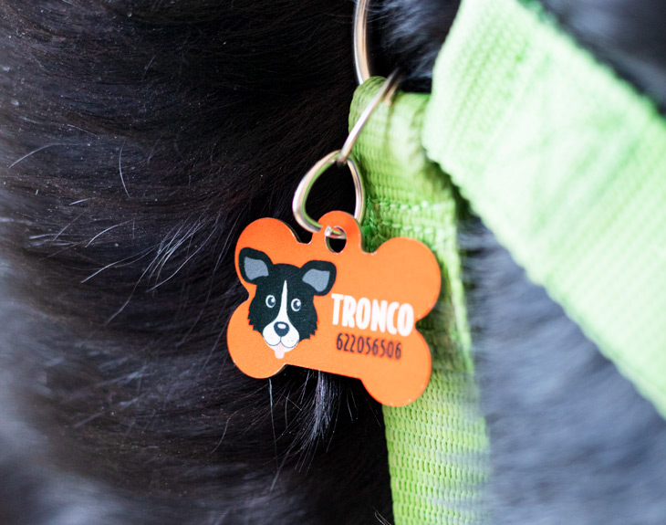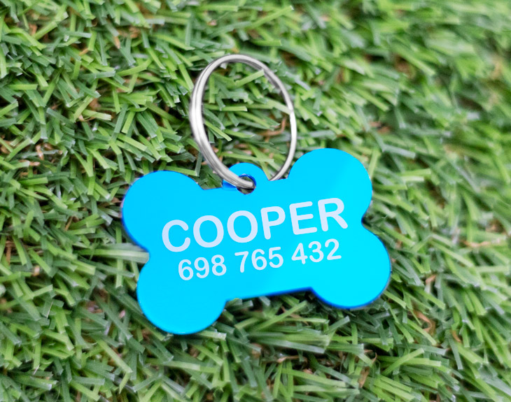 - Colgantes personalizados: Si tu perro es de esos a los que les encanta correr y jugar como un loco, necesita uno de nuestros colgantes personalizados. Se trata de una pequeña placa para colgar en su collar con su nombre y vuestro teléfono, para que en el caso de que algún día se pierda, puedan localizaros rápidamente. Además de ser un regalo muy práctico, tiene una forma de huesito súper graciosa. ¡Tu perro se sentirá mucho más seguro y mucho más guapo!