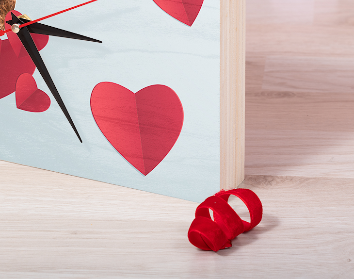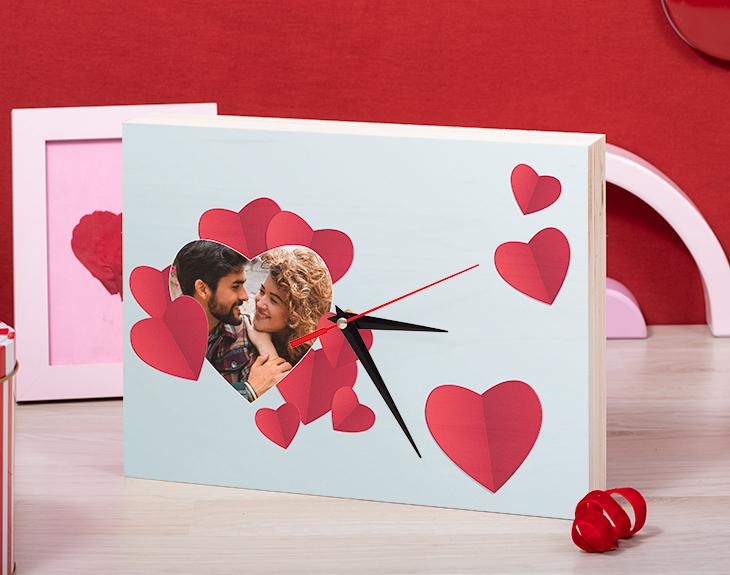 Personaliza un reloj con vuestra foto más romántica. Para que sea aun más especial, ponemos unos cuantos corazoncitos doblados por la mitad, como si estuvieran hechos de papel. Romántico, elegante y siempre puntual. Tienes dos opciones de compra: Medidas reloj de pared: 49,5 x 30 cm. Medidas reloj de mesa: 27 x 20 cm. Importante: Las maderas tienen vetas y estas quedan reflejadas en la imagen. Instalación: el reloj de pared cuenta con agujeros en la parte posterior, hechos a medida por si quieres colgarlo utilizando tornillos, chinchetas, o lo que creas conveniente. ¡Cabrán perfectamente en los agujeros que vienen incluidos en la madera!