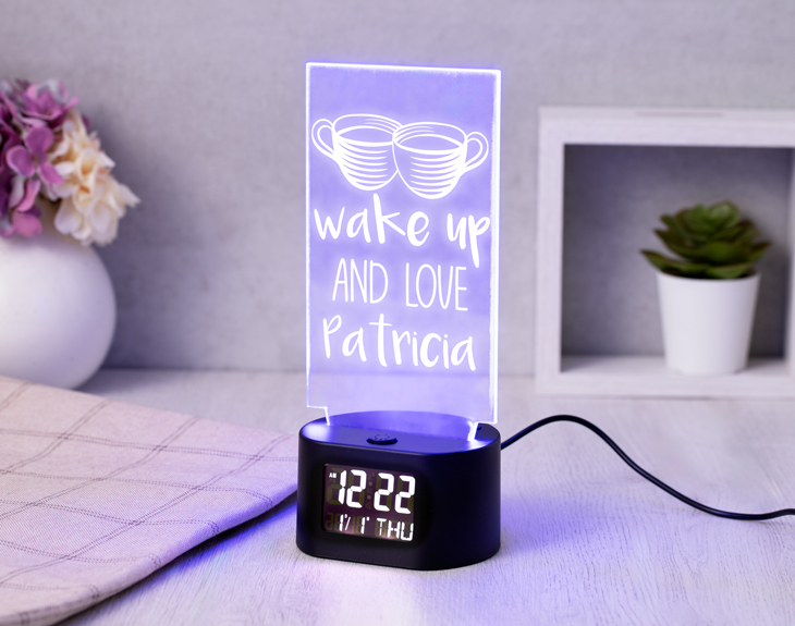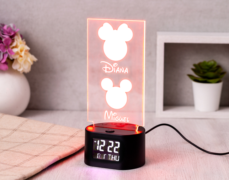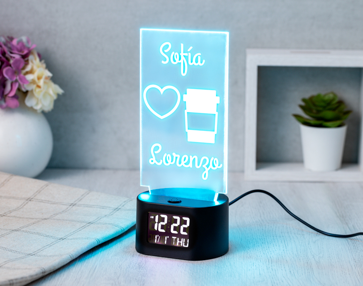 Si el amor ha llamado a tu puerta y estás deseando darle una sorpresa a la persona más importante de tu vida, este reloj-despertador luminoso personalizado es perfecto para despertaros todos los días llenos de amor. Si todavía no os habéis mudado juntos, es un buen regalo para mandarle el mensaje oculto. ¡Dirá que sí seguro! Solo tendrás que decirnos vuestros nombres y diseñaremos el reloj como se puede observar en la imagen del producto. Ha llegado la hora de demostrar que tu amor no tiene fronteras y que vas a luchar por él hasta el fin del mundo. ¡Qué romántico todo! El regalo está formado por una lámina de metacrilato y un reloj digital con la hora y la fecha. Además, podrás programar las alarmas que necesites para cuando llegue la hora de despertarse. Puedes encenderlo usando pilas (para poner en marcha el reloj) y conectándolo a la luz (para que se ilumine). Se quedará sin palabras cuando vea este festival de luces con vuestro nombre. ¡Ahora te toca lucir de historia de amor! Importante: el propio reloj te dará la posibilidad de elegir el color de las luces. Si pulsas una vez te saldrá un color, si pulsas de nuevo, aparecerá otro, y así sucesivamente. También podrás elegir la opción intermitente: ¡todas las luces creando un festín de colores! Medidas aproximadas de la base: 8,5x7,5x5cm. Importante: puedes encenderlo usando pilas (para poner en marcha el reloj) y conectándolo a la luz (para que se ilumine). La base es un reloj despertador. Importante: la pantalla del reloj muestra la hora ininterrumpidamente, y tiene un botón “light zzz” para que se encienda la luz durante unos pocos segundos. Importante: pilas no incluidas.