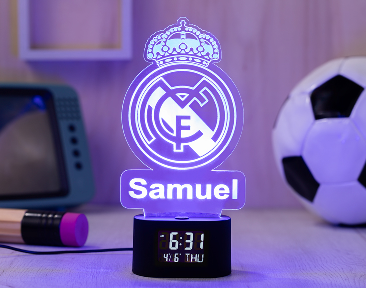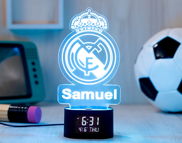 Si tienes un amigo o familiar futbolero/a, ya habrás visto que están hablando de fútbol a todas horas. Y si no, están buscando el momento ideal para echar una pachanga como si fueran Ronaldo o Griezmann. De entre todo el merchandising futbolístico o regalos originales de equipos de fútbol, hay uno que les va a parecer tan inesperado como un gol de penalti en el minuto 91: este reloj despertador de metacrilato personalizado. ¡Así nunca llegarán tarde a su próximo partido o a tu próxima cita con ellos! Cumple el sueño de esa persona tan especial y hazle sentirse como un jugador más de su equipo favorito. Ya sea el Madrid, el Atleti o el Manchester United, creamos a tu medida este diseño personalizado con el escudo de tu equipo de fútbol y tu nombre. ¡Tardarás menos en hacerlo que Modric llegando a la portería contraria! Tan solo tienes que añadir el producto al carrito, pinchar en el botón de personalización y escribir el nombre del equipo cuyo escudo quieres como silueta del metacrilato y el nombre a grabar justo debajo. Si tienes dudas sobre un escudo, no dudes en contactarnos y te ayudaremos tan eficientemente como nos ayudó Del Bosque a ganar el mundial. Este regalo original para aficionados al fútbol está pensado para todo tipo de hinchas y seguidores amantes del deporte. Por ello, además de escoger nombre y escudo, también tendrás varios colores para lucir la lámpara que puedes variar con tan solo pulsar suavemente el botón. ¡Tú eliges si funciona con pilas o con cable! Ideal como complemento original de fútbol para la mesita de noche, y a soñar como si fueras el delantero de tu equipo favorito. Medidas aproximadas de la base: 8,5x7,5x5cm. Funcionamiento: La lámpara funciona con un cable USB (incluido). Puede configurarse en diferentes colores, para que se adapte a tus gustos: si pulsas una vez te saldrá un color, si pulsas de nuevo, aparecerá otro, y así sucesivamente. También podrás elegir la opción intermitente: ¡todas las luces creando un festín de colores! Importante: recomendamos no limpiar con líquidos, sólo con un paño en seco o ligeramente húmedo, y evitar los productos químicos. Importante: puede que el metacrilato llegue con un plástico protector. Importante: puedes encenderlo usando pilas (para poner en marcha el reloj) y conectándolo a la luz (para que se ilumine). Importante: el propio reloj te dará la posibilidad de elegir el color de las luces. Si pulsas una vez te saldrá un color, si pulsas de nuevo, aparecerá otro, y así sucesivamente. También podrás elegir la opción intermitente: ¡todas las luces creando un festín de colores! Importante: la pantalla del reloj muestra la hora ininterrumpidamente, y tiene un botón “light zzz” para que se encienda la luz durante unos pocos segundos. Importante: pilas no incluidas.