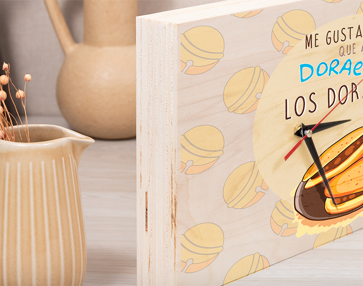 El reloj está fabricado en madera de chopo de la mejor calidad. Lo que da como resultado un regalo duradero, resistente y con un acabado muy agradable y cálido. Además, podemos conseguirlo en dos tamaños diferentes, en función de dónde queramos colocarlo. Si lo queremos para decorar la mesilla del dormitorio, por ejemplo, podemos optar por el reloj de mesa mientras que, si preferimos colgarlo en el salón, podemos optar por el reloj de pared.