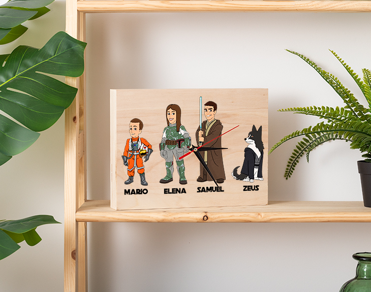 ¿Quién no ha querido convertirse en un personaje del fantasioso universo de 'Star Wars'? El mundo creado por George Lucas ha dado lugar a más de diez películas, infinidad de merchandising y millones y millones de fanáticos en todo el mundo, que han vivido las aventuras de los Skywalker como si fueran suyas. ¡Seguro que no veían la hora de volver a adentrarse en esta particular galaxia! Si queréis aprovechar todo el tiempo del mundo en familia, y queréis volver a entreteneros con estas aventuras espaciales, este reloj personalizado no solo os dirá la hora que es... ¡también os convertirá en personajes del mismísimo universo de 'Star Wars'! ¿Te gustaría formar parte del lado oscuro de la Fuerza, o quieres convertirte en todo un Jedi? ¿Piloto de la República o soldado imperial? ¡Tienes más de 4000 personajes entre los que escoger! Si queréis sentiros como unos habitantes más de Tatooine, no te hará falta volver a ver todas las pelis de este extraordinario mundo. ¡Ahora podrás convertirte en un personaje más! Crea tu propia familia en este regalo original y sorprende a toda la casa con él. Tienes dos opciones de compra: Medidas reloj de pared: 49,5 x 30 cm. Medidas reloj de mesa: 27 x 20 cm. Importante: Las maderas tienen vetas y estas quedan reflejadas en la imagen. A partir de 6 personajes, estos se distribuirán en dos filas en el reloj. Es decir: - Familia de 6 personajes: 3 en la fila superior, y 3 en la inferior. - Familia de 7 personajes: 4 en la fila superior, y 3 en la inferior. - Familia de 8 personajes: 4 en la fila superior, y 4 en la inferior. Instalación: El reloj de pared cuenta con agujeros en la parte posterior, hechos a medida por si quieres colgarlo utilizando tornillos, chinchetas, o lo que creas conveniente. ¡Cabrán perfectamente en los agujeros que vienen incluidos en la madera!