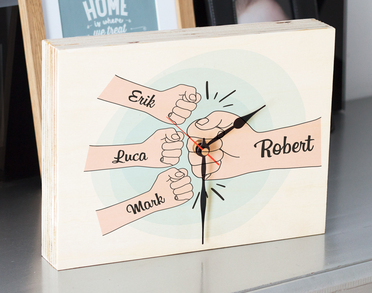 Sin duda, el mejor detalle de este regalazo es la personalización que incluye este reloj de mesa o de pared. Si tu padre es como el capitán de la familia y siempre os ha enseñado a conseguir vuestras metas, este diseño le encantará. Podrás elegir el número de puñitos que quieras y el color que mas os guste, después te tocará escribir los nombres que quieras y listo.