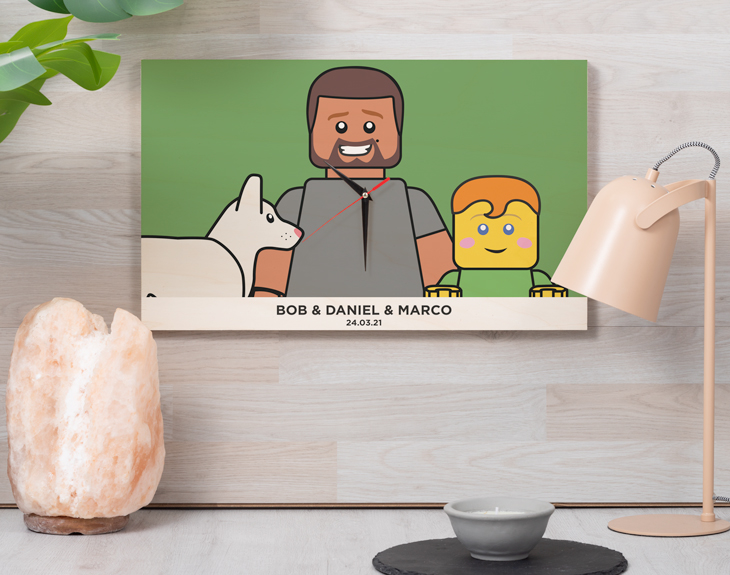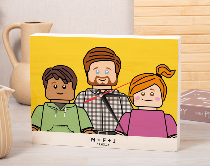 ¿Te imaginas que cada vez que mires la hora, veas a toda tu familia convertida en Lego? Sin duda, será chulísimo. Si en tu casa os habéis pasado tardes enteras jugando con las piezas de Lego, está claro que nuestro reloj de madera personalizado con diseño "Padre Lego Pop". ¡Es una preciosa forma de recordar esas tardes tan divertidas! Y es que, si tu padre es un auténtico fan de estas piezas tan chulas... ¡Este reloj será el mejor regalo que le puedes hacer! Ya sea por el Día del Padre, por su cumpleaños o por un amigo invisible es ideal para sorprenderle. Podrás crear a tu propia familia de Legos, quedará genial. Es perfecto para ponerlo en la cocina o en el salón y tener la hora a mano. Personalizar este reloj de madera es súper sencillo. El primer paso a seguir consiste en añadir el producto al carrito y entrar al área de personalización. Una vez ahí, ya puedes crear los avatares desde cero, ya verás qué divertido. Pronto estará perfecto y listo para regalar. ¡Será un original regalo para fans de Lego! Incluye un pack de manecillas y motorcito para que giren en el sentido horario. Tienes dos opciones de compra: Medidas reloj de pared: 49,5 x 30 cm. Medidas reloj de mesa: 27 x 20 cm. Importante: Las maderas tienen vetas y estas quedan reflejadas en la imagen. Instalación: El reloj de pared cuenta con agujeros en la parte posterior, hechos a medida por si quieres colgarlo utilizando tornillos, chinchetas, o lo que creas conveniente. ¡Cabrán perfectamente en los agujeros que vienen incluidos en la madera!