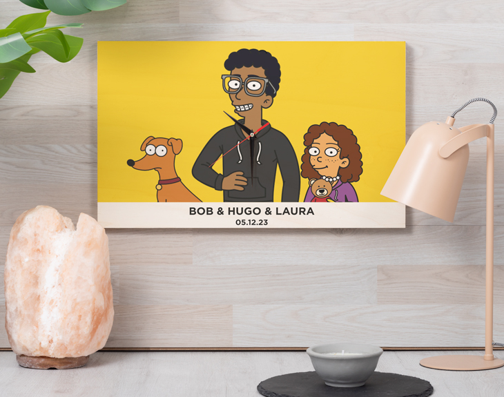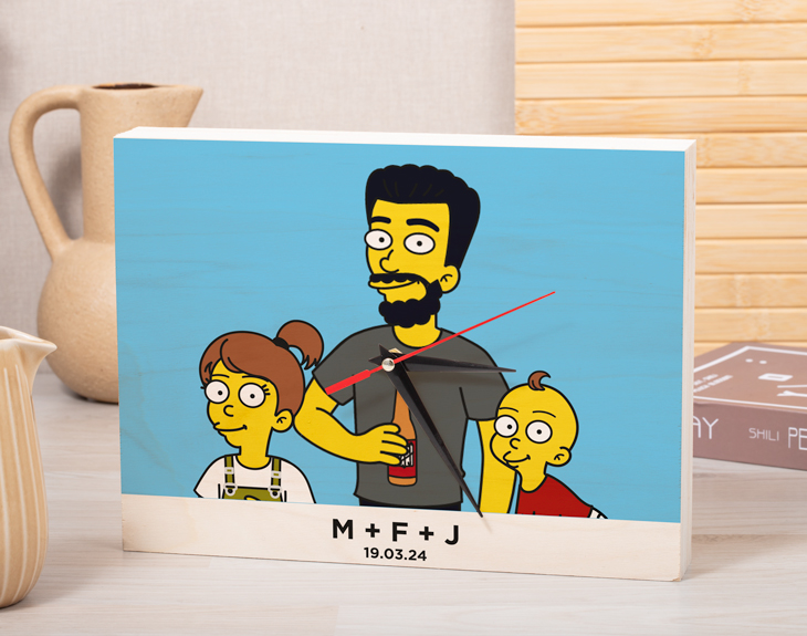 Si en tu casa sois todos súper fans de la serie de Los Simpson y no os habéis perdido ningún capítulo... Seguro que alguna vez os habéis preguntado como seríais si hubieseis nacido en Springfield. Con nuestro reloj de madera personalizado, podrás representar a todos tus familiares en forma de Simpson. ¡Seréis la familia más goals de todos Springfield! Si dentro de poco se acerca alguna fecha especial como un cumpleaños o el Día del Padre, este reloj de madera se convetirá en el mejor regalo que le puedes hacer. Es una preciosa forma de agradecerle todo lo que hace por vosotros. Además, es genial para colocarlo en una mesa o, si escoges la opción más grande, se puede colgar en la pared. Para personalizar este reloj de madera, el primer paso a seguir consiste en añadir el producto al carrito y entrar al área de personalización. Una vez ahí, ya puedes crear a estos avatares Simpson como tú quieras. Pronto estará perfecto y listo para regalar. ¡Será un original regalo para fans de Simpson! Únicamente la madera con el diseño ya es todo un detalle para papá, pero es que también es un reloj. Incluye un pack de manecillas y motorcito para que giren en el sentido horario. Un regalo de lo más original tan útil como bonito y duradero. ¡Ya verás lo robusta que es la placa de madera! Tienes dos opciones de compra: Medidas reloj de pared: 49,5 x 30 cm. Medidas reloj de mesa: 27 x 20 cm. Importante: Las maderas tienen vetas y estas quedan reflejadas en la imagen. Instalación: El reloj de pared cuenta con agujeros en la parte posterior, hechos a medida por si quieres colgarlo utilizando tornillos, chinchetas, o lo que creas conveniente. ¡Cabrán perfectamente en los agujeros que vienen incluidos en la madera!