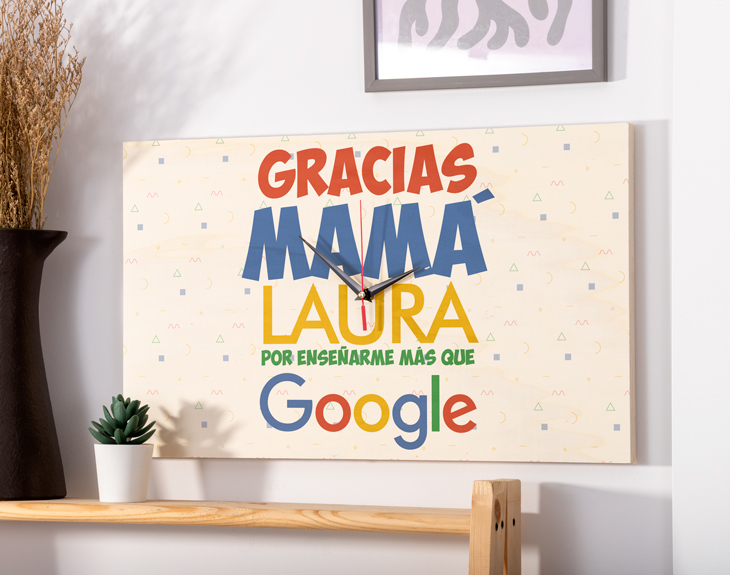 Te ha enseñado todo lo que sabes, te ha inculcado los mejores valores del mundo y te ha ayudado con cada problema que has tenido... Si tu madre ha jugado un papel indispensable en tu formación, es hora de agradecérselo. Nuestro reloj de madera personalizado "Mi mamá es como Google" es perfecto para la persona más inteligente que existe...¡Se quedará sin palabras! Tienes dos opciones de compra: Medidas reloj de pared: 49,5 x 30 cm. Medidas reloj de mesa: 27 x 20 cm. Importante: Las maderas tienen vetas y estas quedan reflejadas en la imagen. Instalación: el reloj de pared cuenta con agujeros en la parte posterior, hechos a medida por si quieres colgarlo utilizando tornillos, chinchetas, o lo que creas conveniente. ¡Cabrán perfectamente en los agujeros que vienen incluidos en la madera!