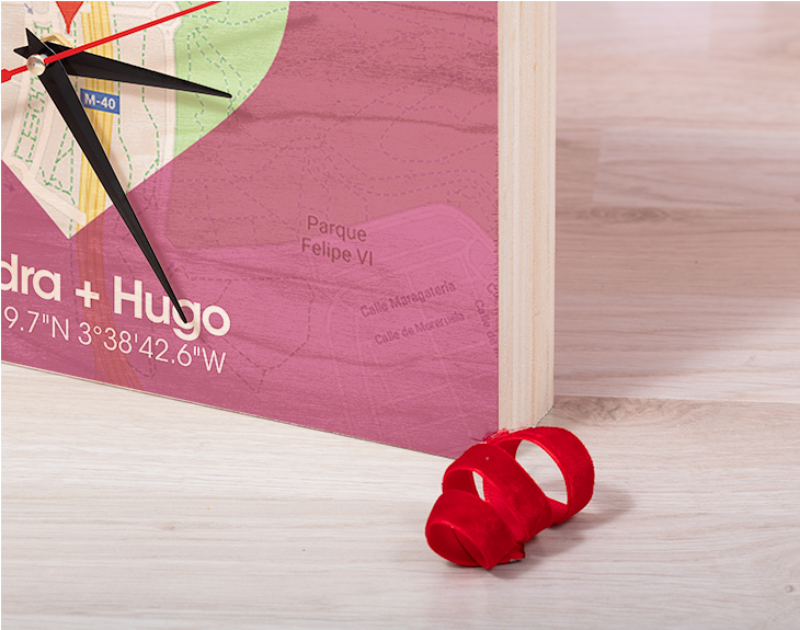 ¿Quieres un reloj personalizado con el lugar más especial de vuestra relación? Aquí tienes el reloj "Mapa del amor", en el cual tendrás un mapa con las coordenadas del sitio y vuestros nombres. ¡El reloj más romántico del planeta! Tienes dos opciones de compra: Medidas reloj de pared: 49,5 x 30 cm. Medidas reloj de mesa: 27 x 20 cm. Importante: Las maderas tienen vetas y estas quedan reflejadas en la imagen. Instalación: El reloj de pared cuenta con agujeros en la parte posterior, hechos a medida por si quieres colgarlo utilizando tornillos, chinchetas, o lo que creas conveniente. ¡Cabrán perfectamente en los agujeros que vienen incluidos en la madera!