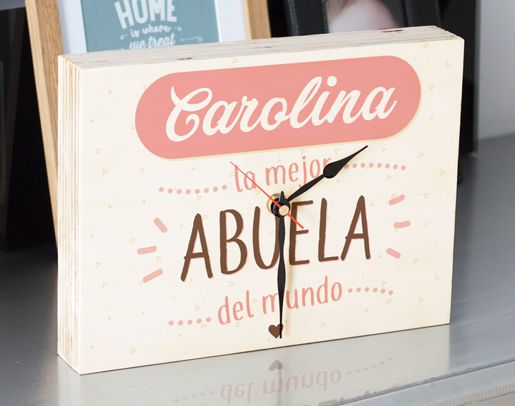 Si tu abuela es sin duda uno de los pilares fundamentales de tu familia, este reloj de madera es perfecto para agradecerle todo lo que hace por vosotros. Y es que, no hay nadie que trate con tanto cariño a sus nietos como ella. Por eso y por mucho más se merece un detalle así de especial. Tienes dos opciones de compra: Medidas reloj de pared: 49,5 x 30 cm. Medidas reloj de mesa: 27 x 20 cm. Importante: Las maderas tienen vetas y estas quedan reflejadas en la imagen. Instalación: el reloj de pared cuenta con agujeros en la parte posterior, hechos a medida por si quieres colgarlo utilizando tornillos, chinchetas, o lo que creas conveniente. ¡Cabrán perfectamente en los agujeros que vienen incluidos en la madera!