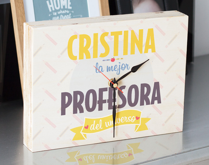 Si queréis sorprender a vuestra profesora por todo lo que habéis aprendido este año con ella, este reloj personalizado es el regalo perfecto. Este reloj de madera personalizado es una forma original y divertida de agradecerle todo su esfuerzo, trabajo y paciencia. Seguro que le hace mucha ilusión que sus alumnos se junten para hacerle un detalle como este. Simplemente nos tenéis que decir el nombre de vuestra súper profe y nosotros lo añadiremos a este diseño tan chulo. ¡Le encantará! Tienes dos opciones de compra: Medidas reloj de pared: 49,5 x 30 cm. Medidas reloj de mesa: 27 x 20 cm. Importante: Las maderas tienen vetas y estas quedan reflejadas en la imagen. Instalación: el reloj de pared cuenta con agujeros en la parte posterior, hechos a medida por si quieres colgarlo utilizando tornillos, chinchetas, o lo que creas conveniente. ¡Cabrán perfectamente en los agujeros que vienen incluidos en la madera!