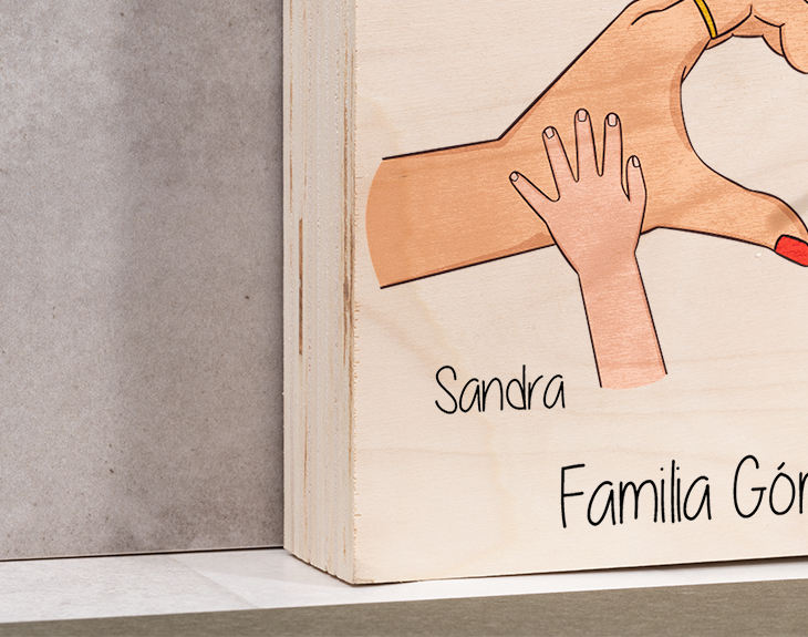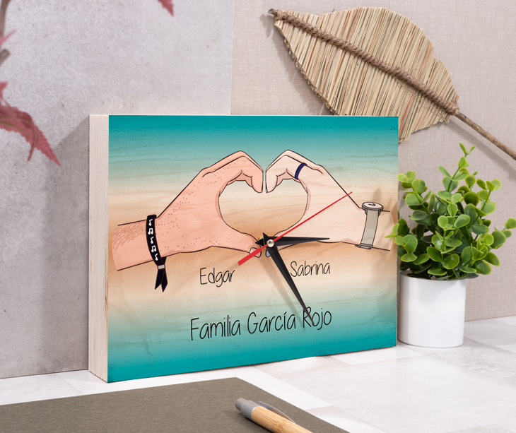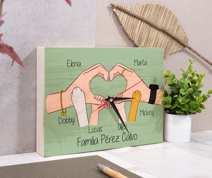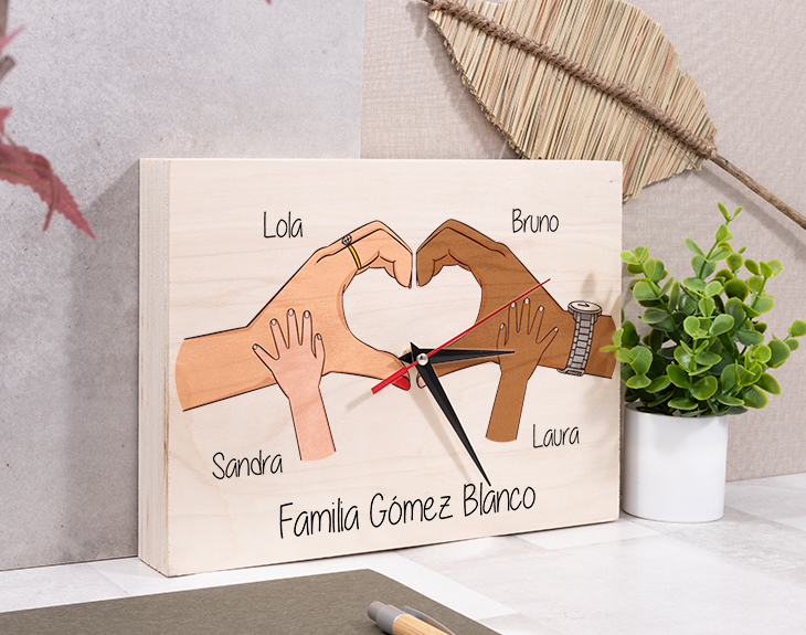 ¡Una familia unida es lo mejor del mundo! Pasar tiempo con tus seres queridos, compartir momentos, hobbies y muchos recuerdos es algo que no tiene precio. Por eso, si quieres que esta unión se vea reflejada en vuestro hogar, necesitáis este reloj de madera personalizado. Este bonito complemento conseguirá darle un toque único y diferente a cualquier rincón donde lo pongáis. Cada vez que miréis la hora os acordaréis de la unión tan bonita que tenéis como familia. ¡Es genial! Si queréis decorar vuestro hogar con algo que os defina como familia, este original reloj de madera es perfecto. Será el regalo ideal para sorprender a las personas que más quieres en fechas como el Día del Padre o de la Madre, cumpleaños, aniversarios... ¡Será el mejor regalo del mundo! Servirá para decorar vuestra casa y que todos vuestros invitados sepan que sois una familia unida y que os queréis por encima de todo. Personalizar este reloj de madera es muy fácil. Primero elige qué tipo de reloj quieres: de mesa o de pared. Añade el producto al carrito y comienza a crear tu propio diseño desde cero. Personaliza estas manos como quieras y añade todos los detalles que necesites. Para terminar, escribe los nombres de todos los miembros de la familia y aparecerán en la parte inferior del diseño. ¡Tu reloj ya estará listo! Tienes dos opciones de compra: Medidas reloj de pared: 49,5 x 30 cm. Medidas reloj de mesa: 27 x 20 cm. Importante: Las maderas tienen vetas y estas quedan reflejadas en la imagen. Instalación: El reloj de pared cuenta con agujeros en la parte posterior, hechos a medida por si quieres colgarlo utilizando tornillos, chinchetas, o lo que creas conveniente. ¡Cabrán perfectamente en los agujeros que vienen incluidos en la madera!